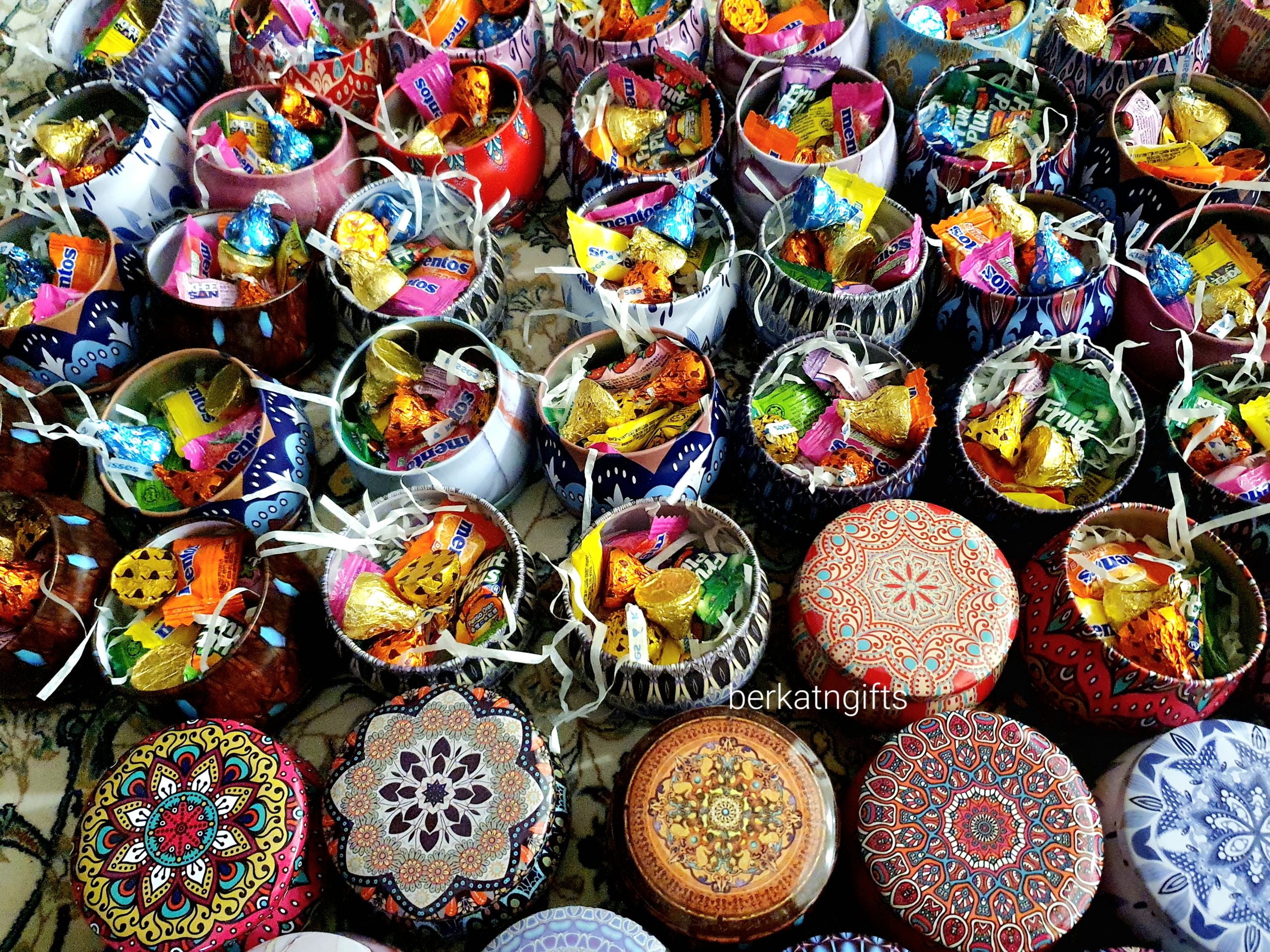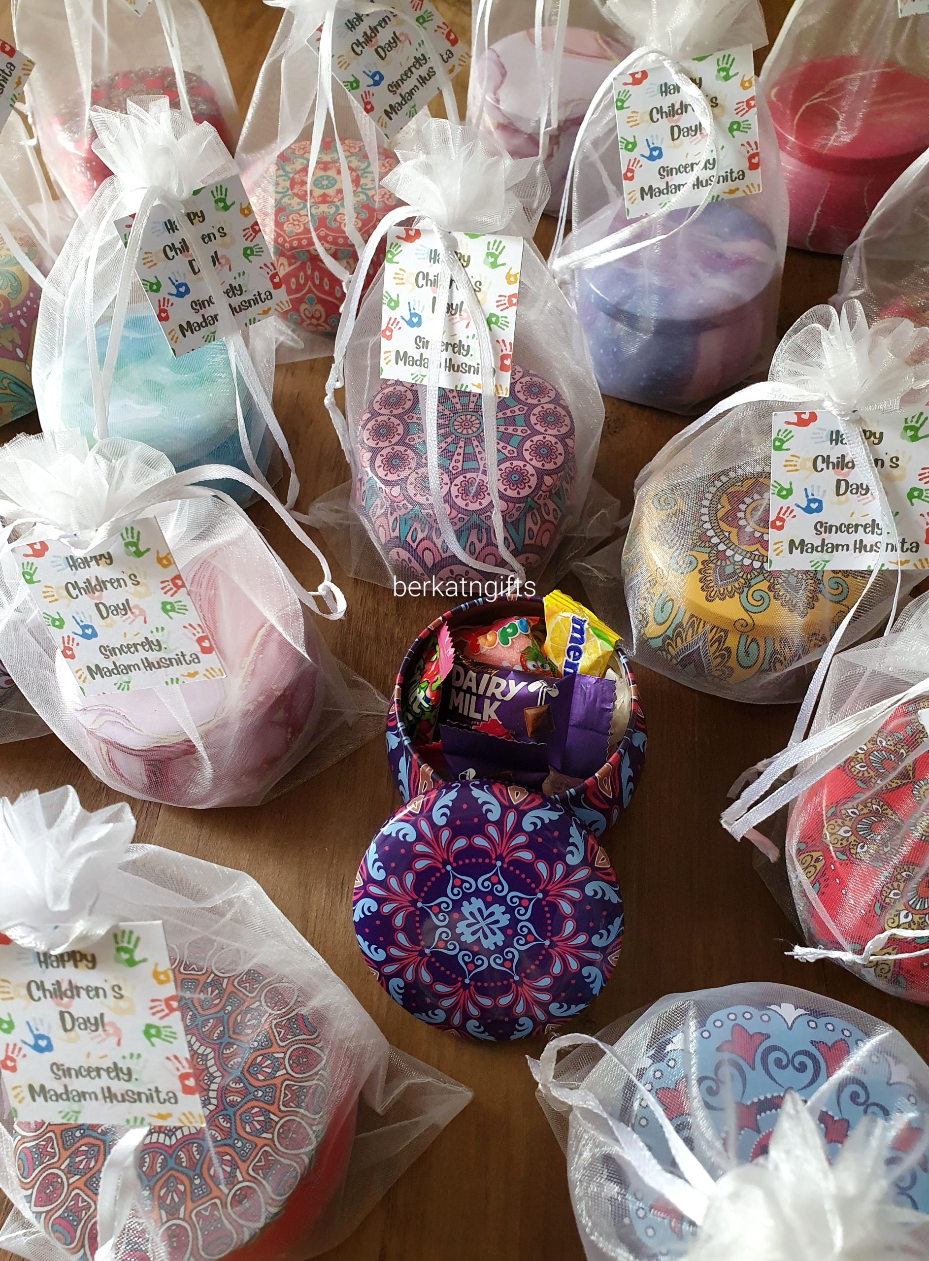 Includes 8pcs mix candies/chocolates in assorted design mint tins. Organza bag included. Customised tag at additional $0.30 each.