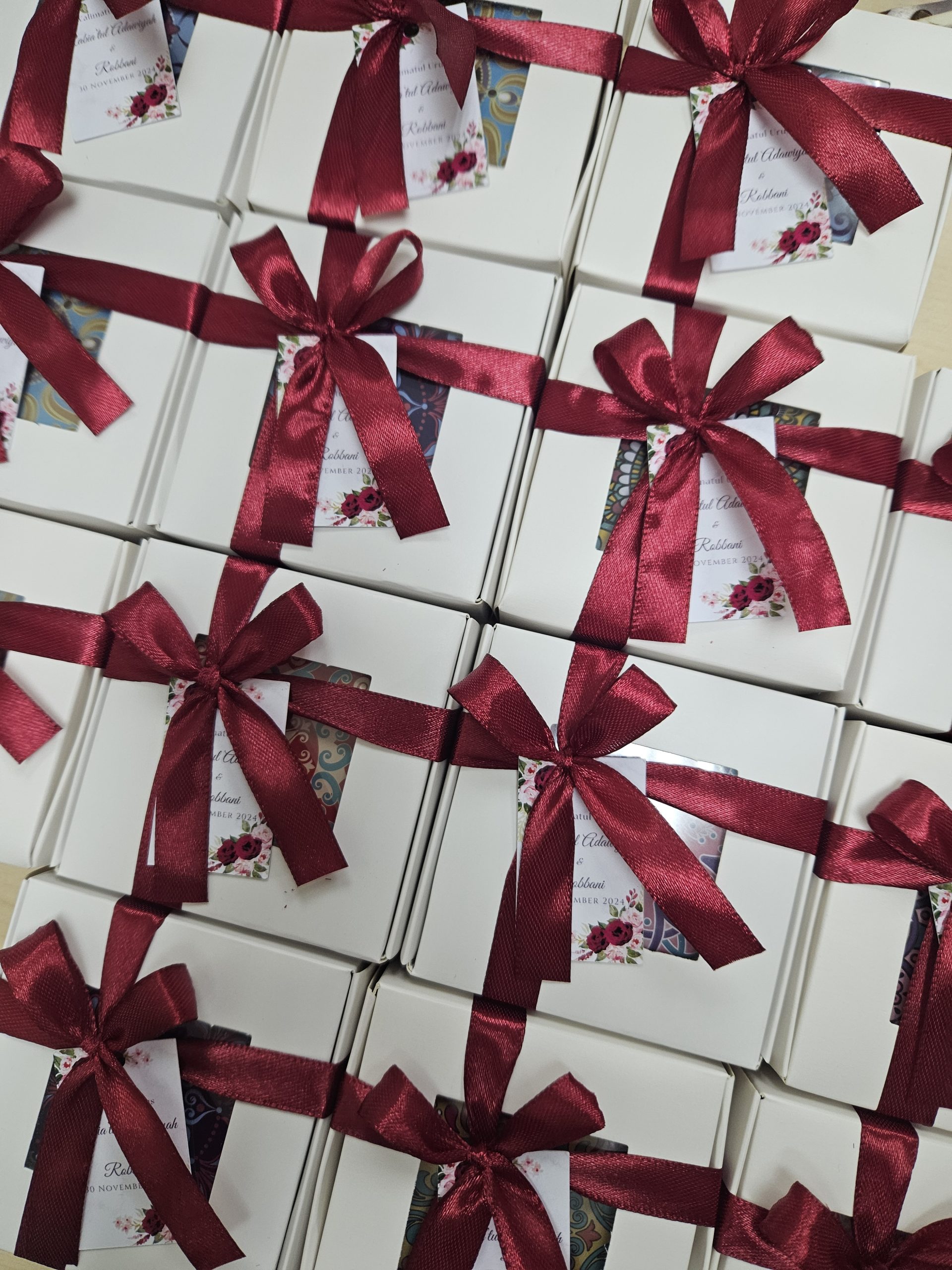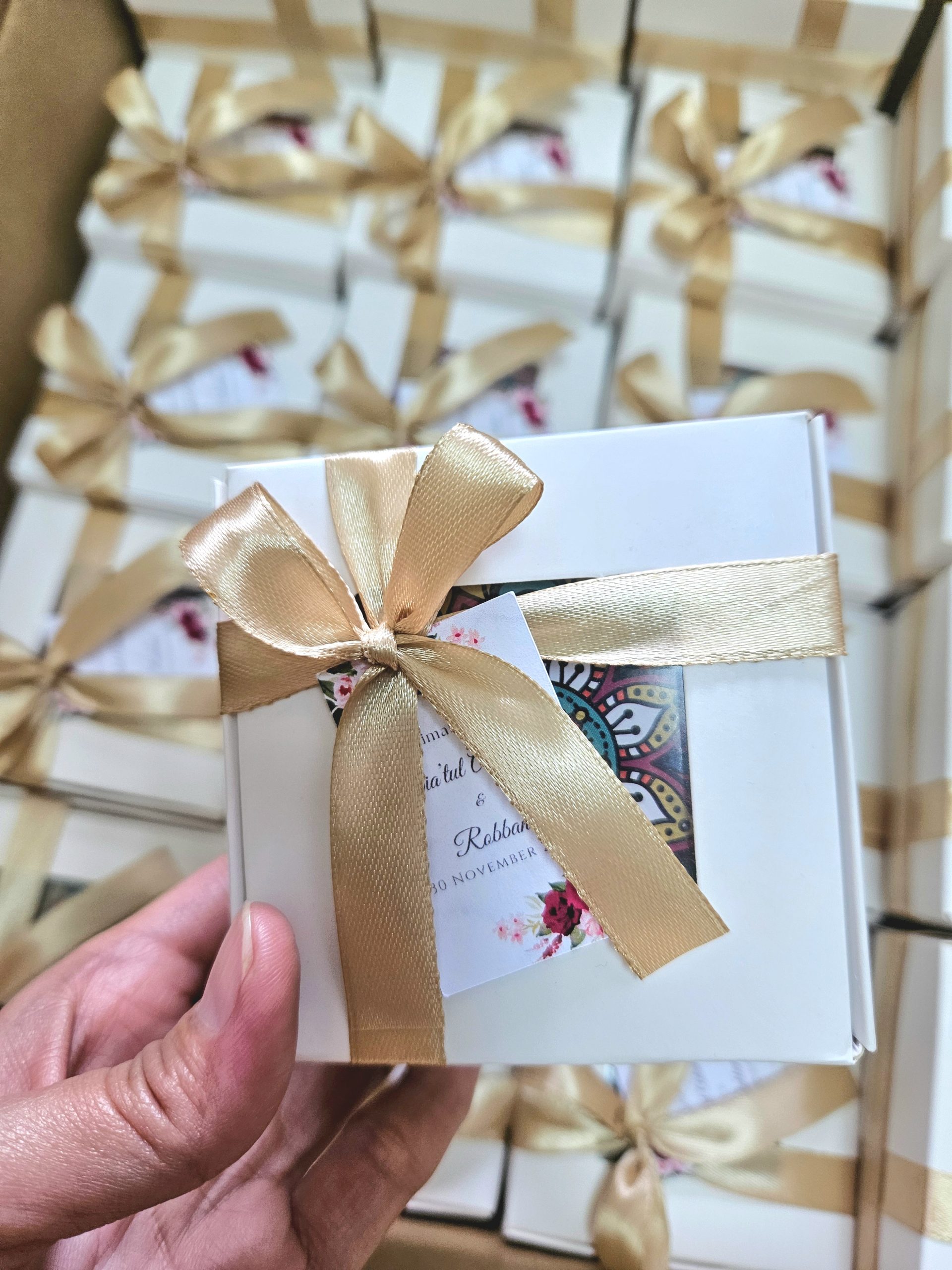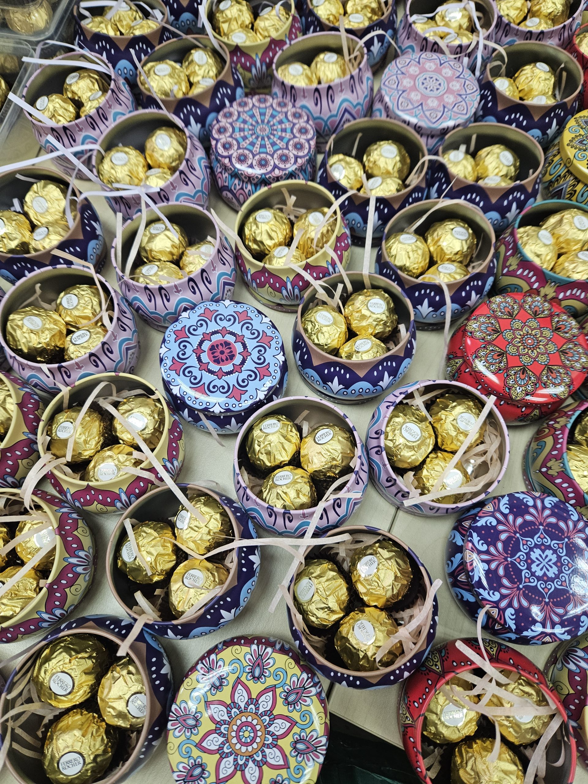 Includes 3pcs Ferrero Rocher chocolate in assorted mint tin designs, packed into white window boxes with ribbon and customised tag.