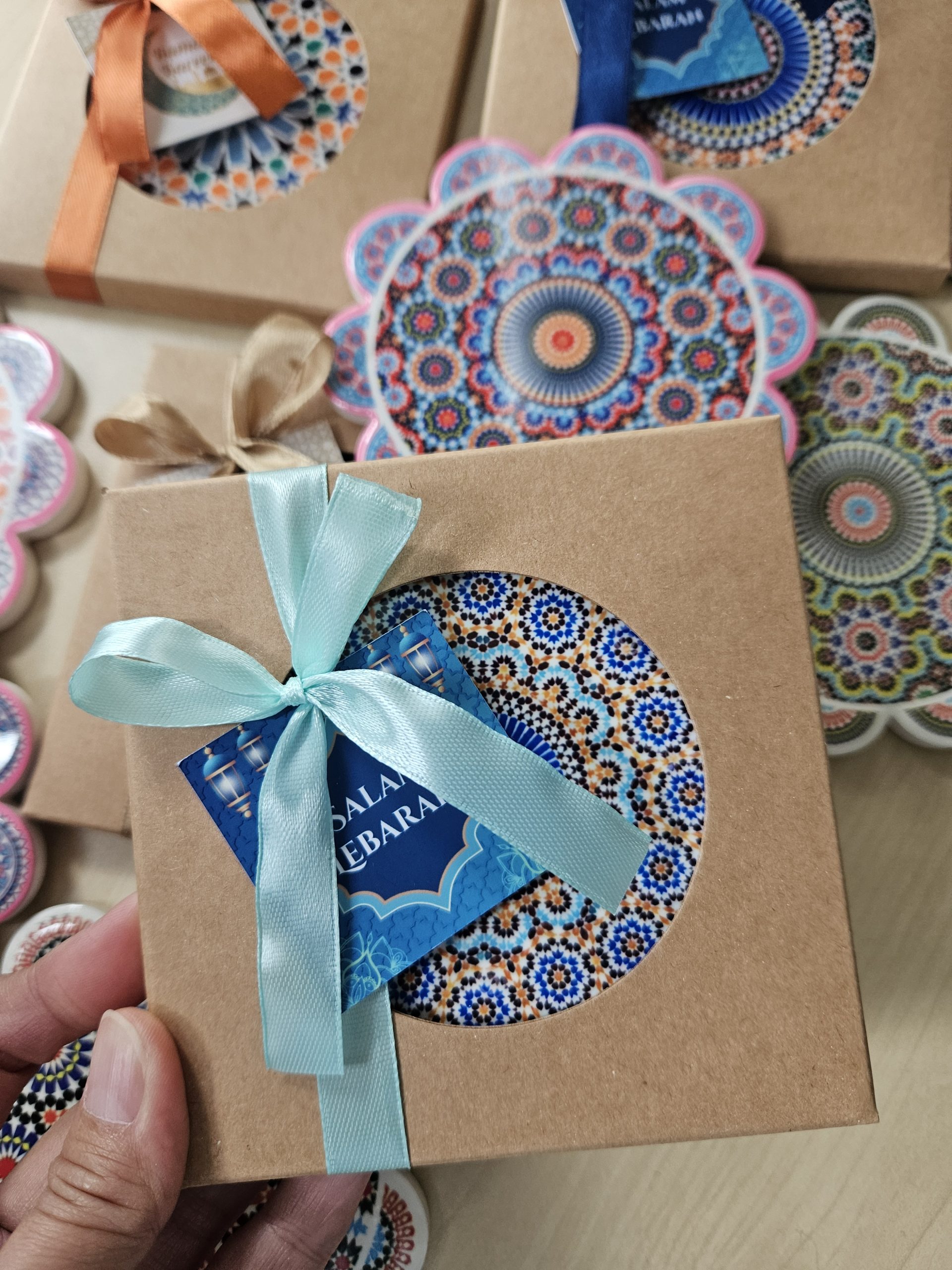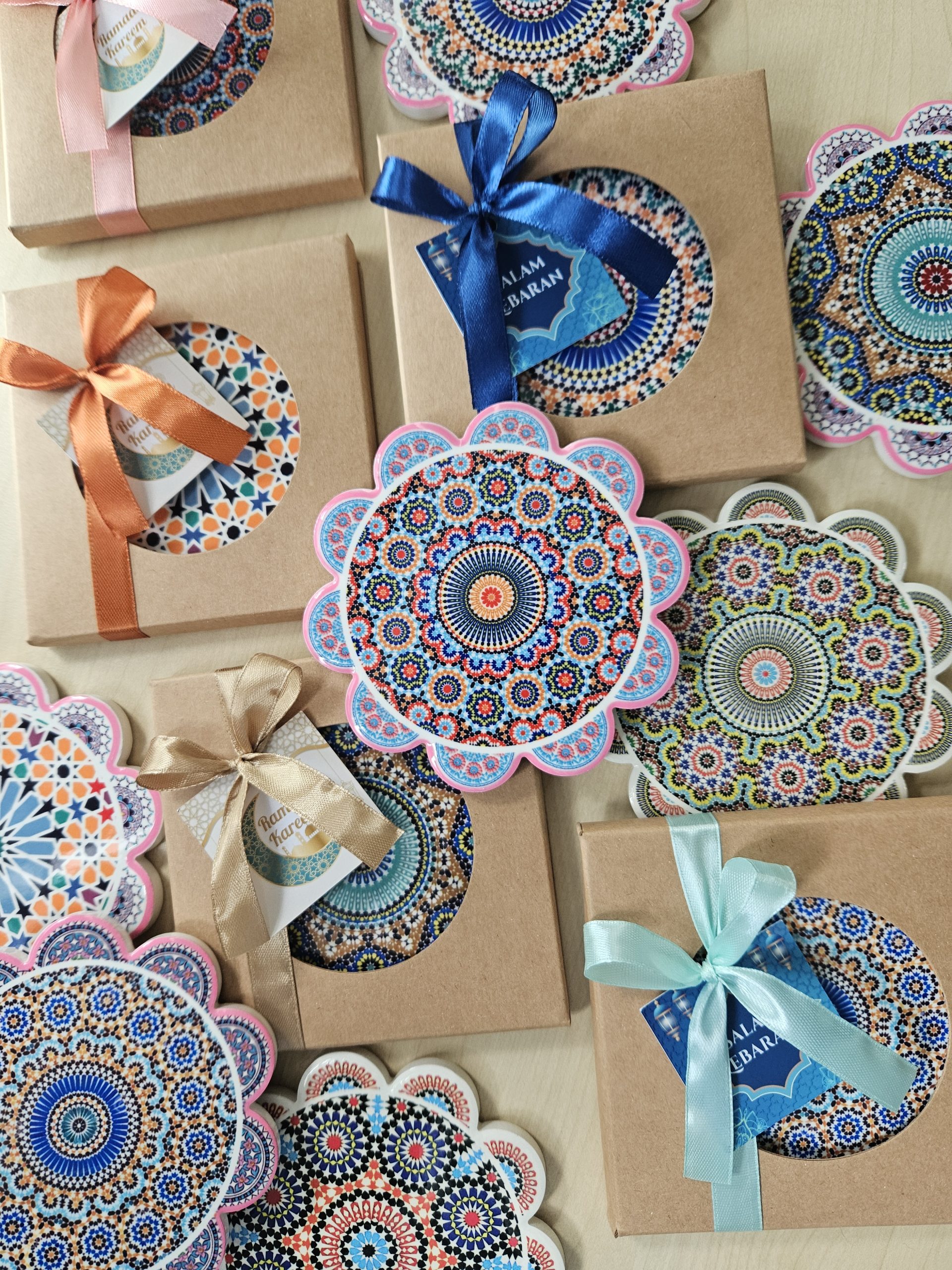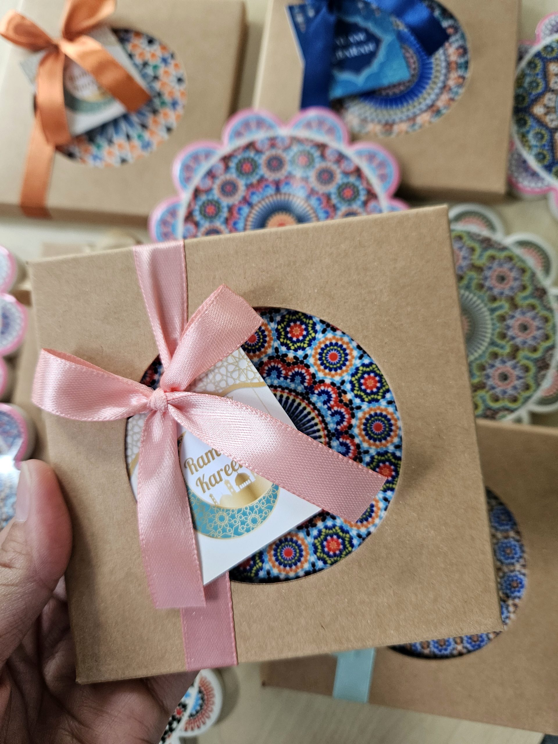 1pc Bohemian ceramic coaster in kraft window box with choice of ribbon and Ramadan/Eid tag.