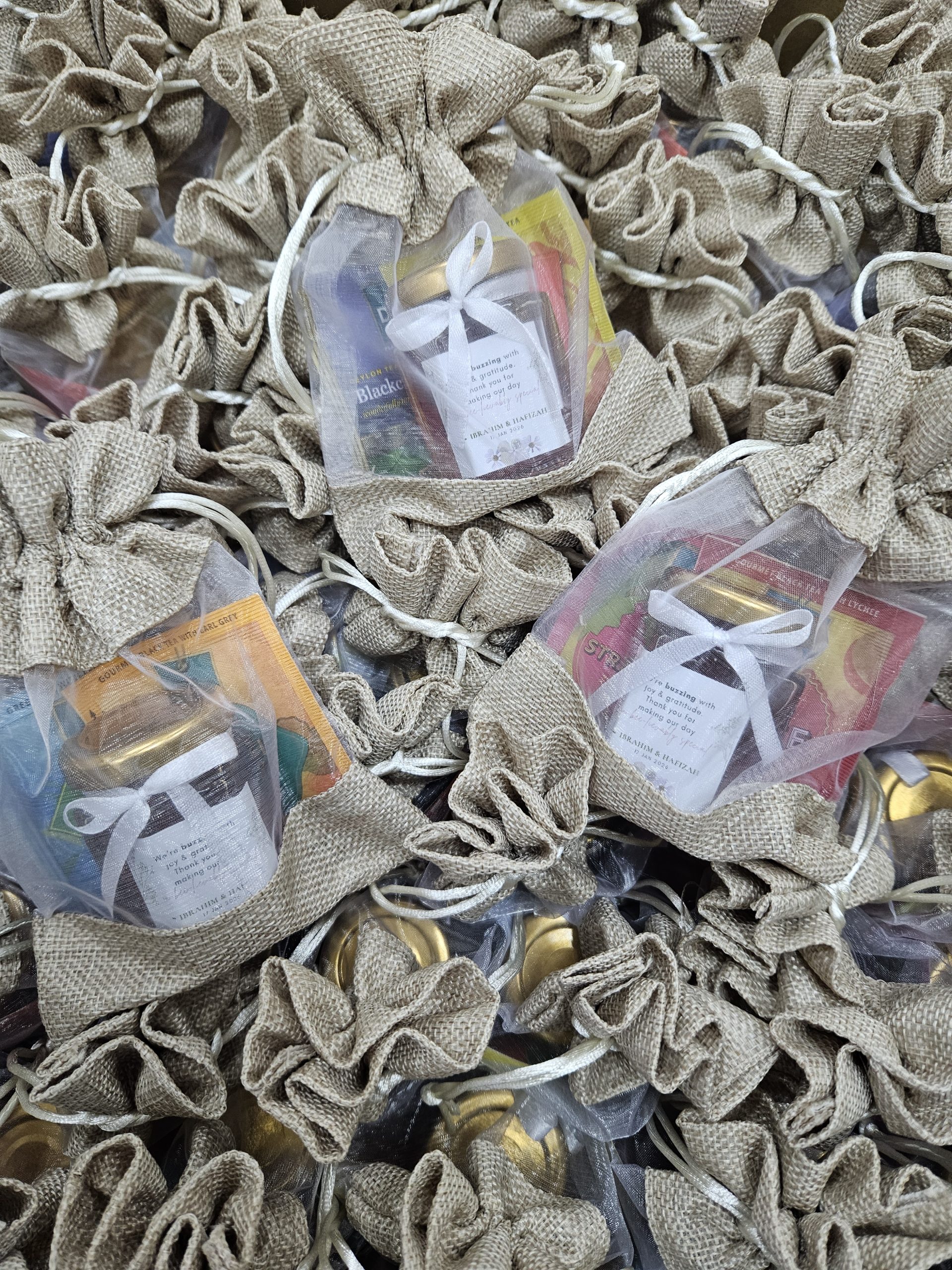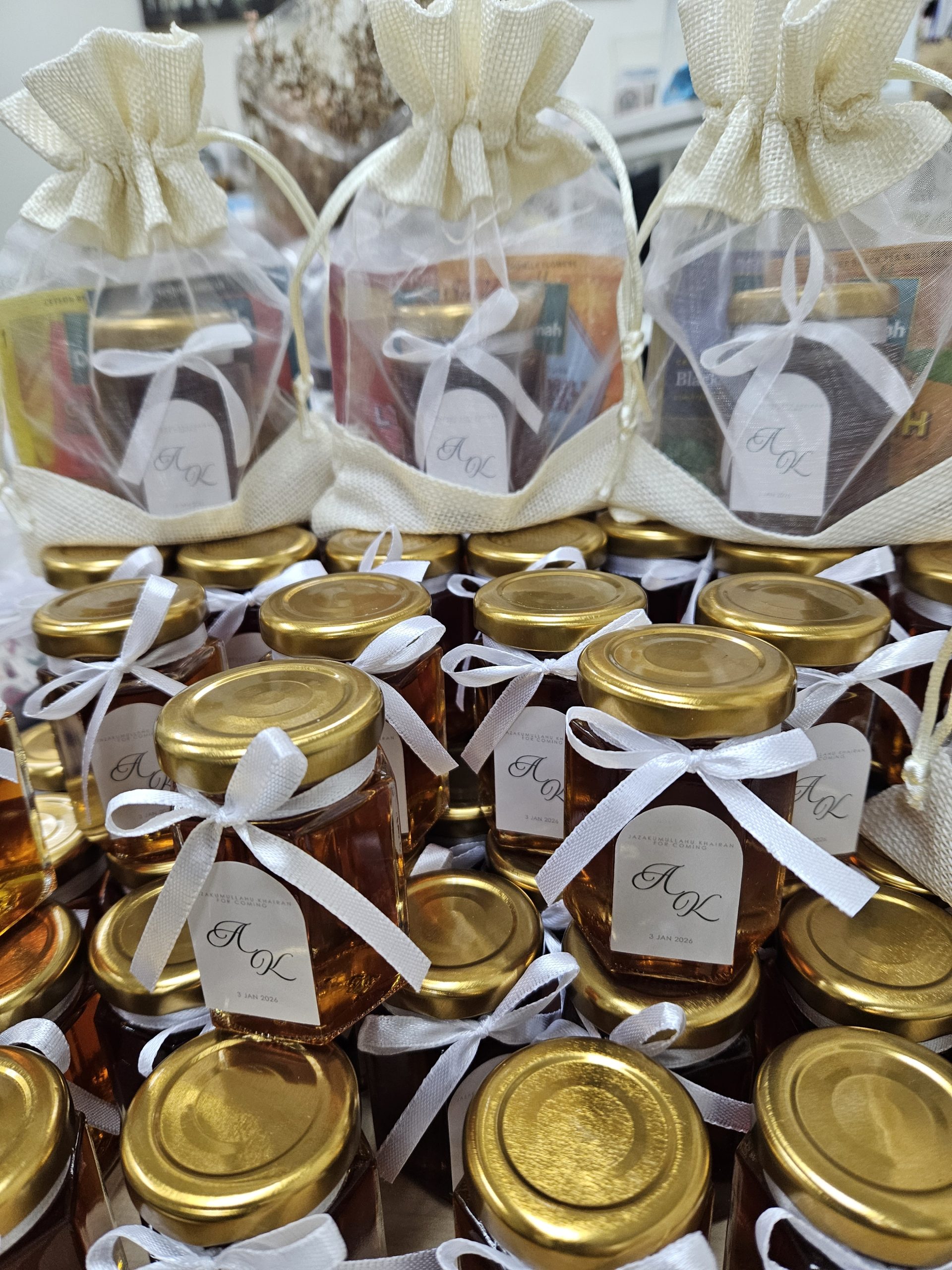 Includes a 65ml honey jar with customised sticker + 2pcs assorted Dilmah teabags, packed in burlap gift pouch.