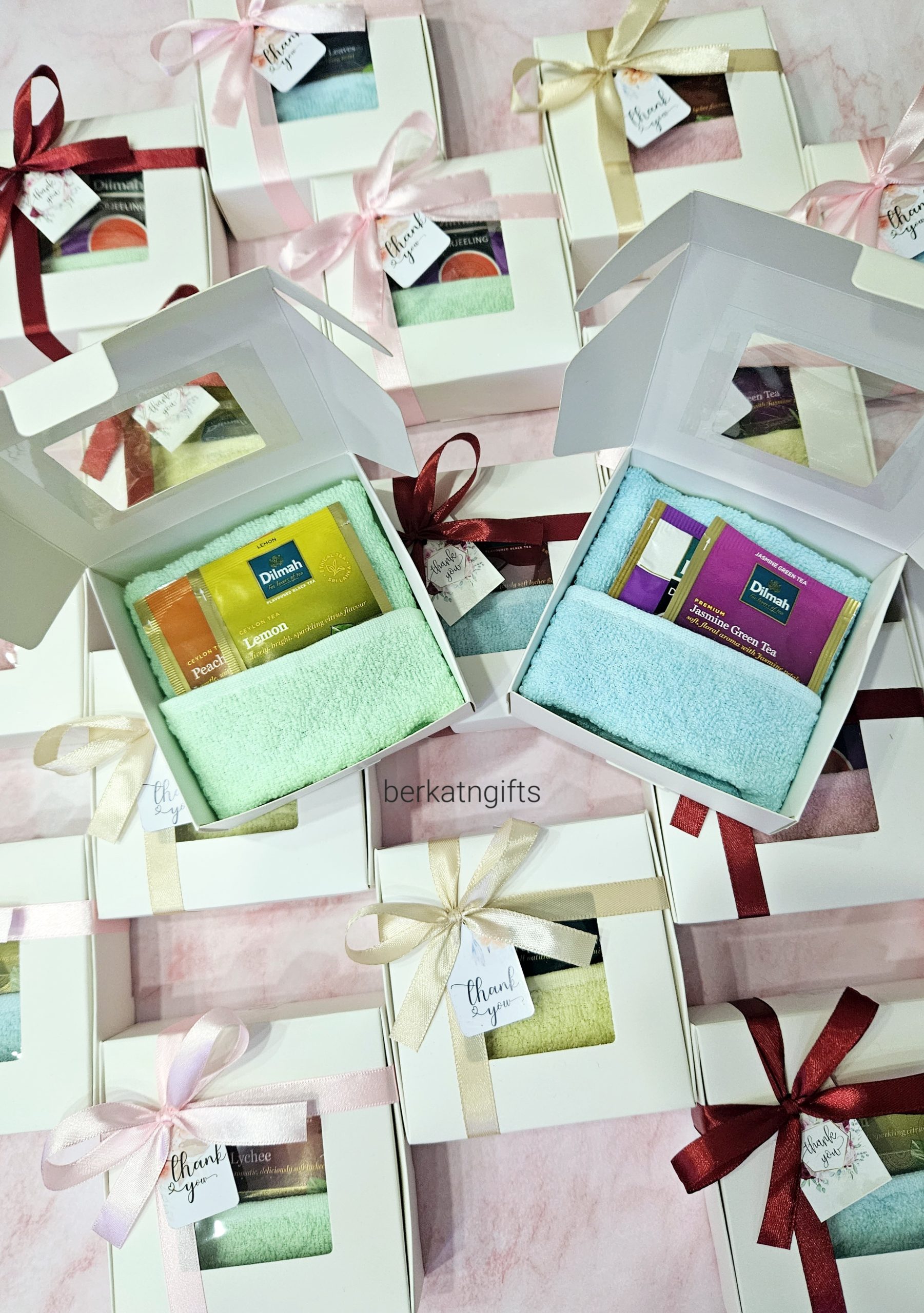 Gift set includes a 25cm square microfiber cloth with assorted flavour 2pcs Dilmah teabags. Ribbon and standard thank you sticker included.