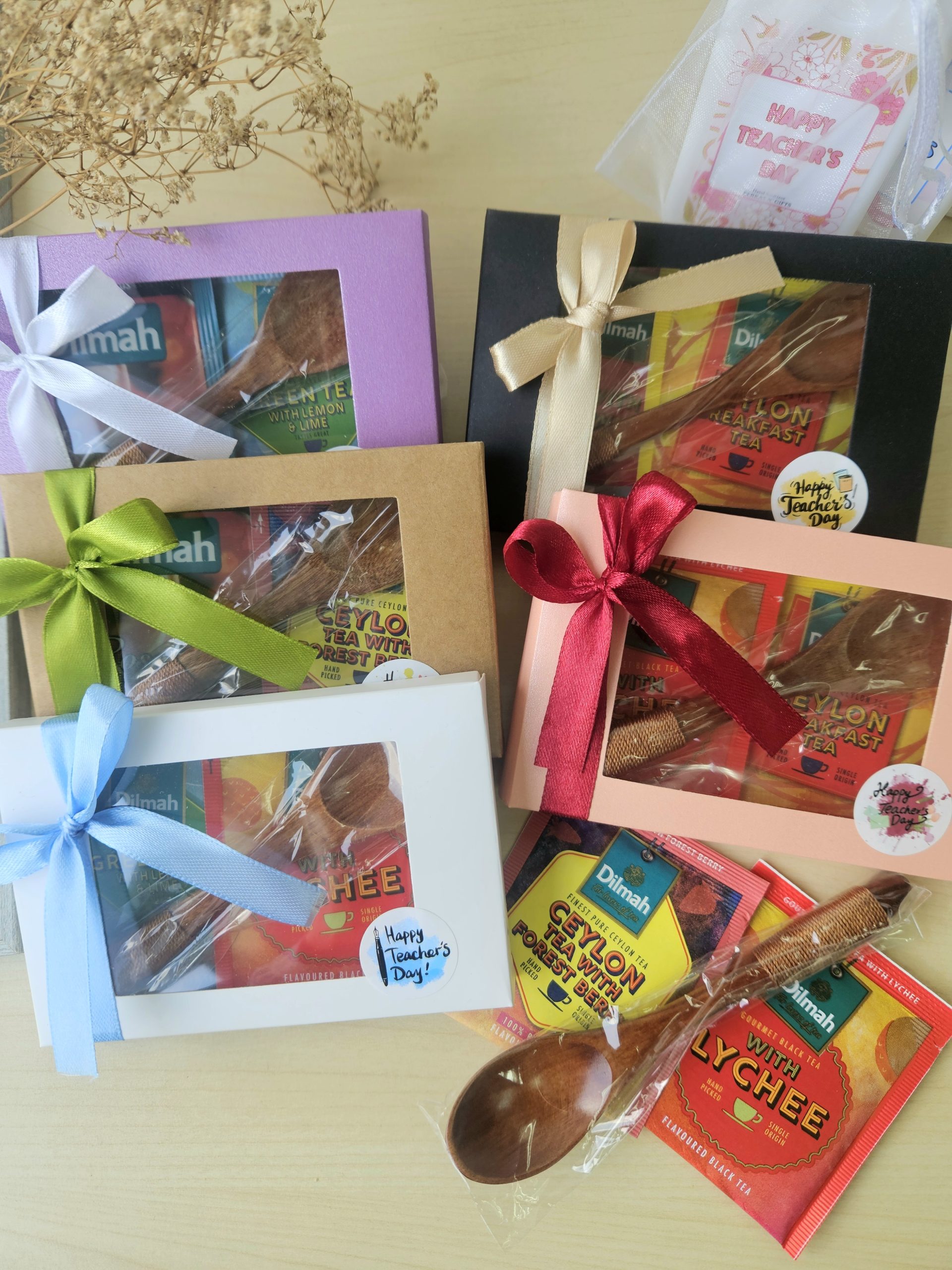 Each box includes 2pcs of assorted Dilmah tea bags & a 14cm wooden tea spoon.