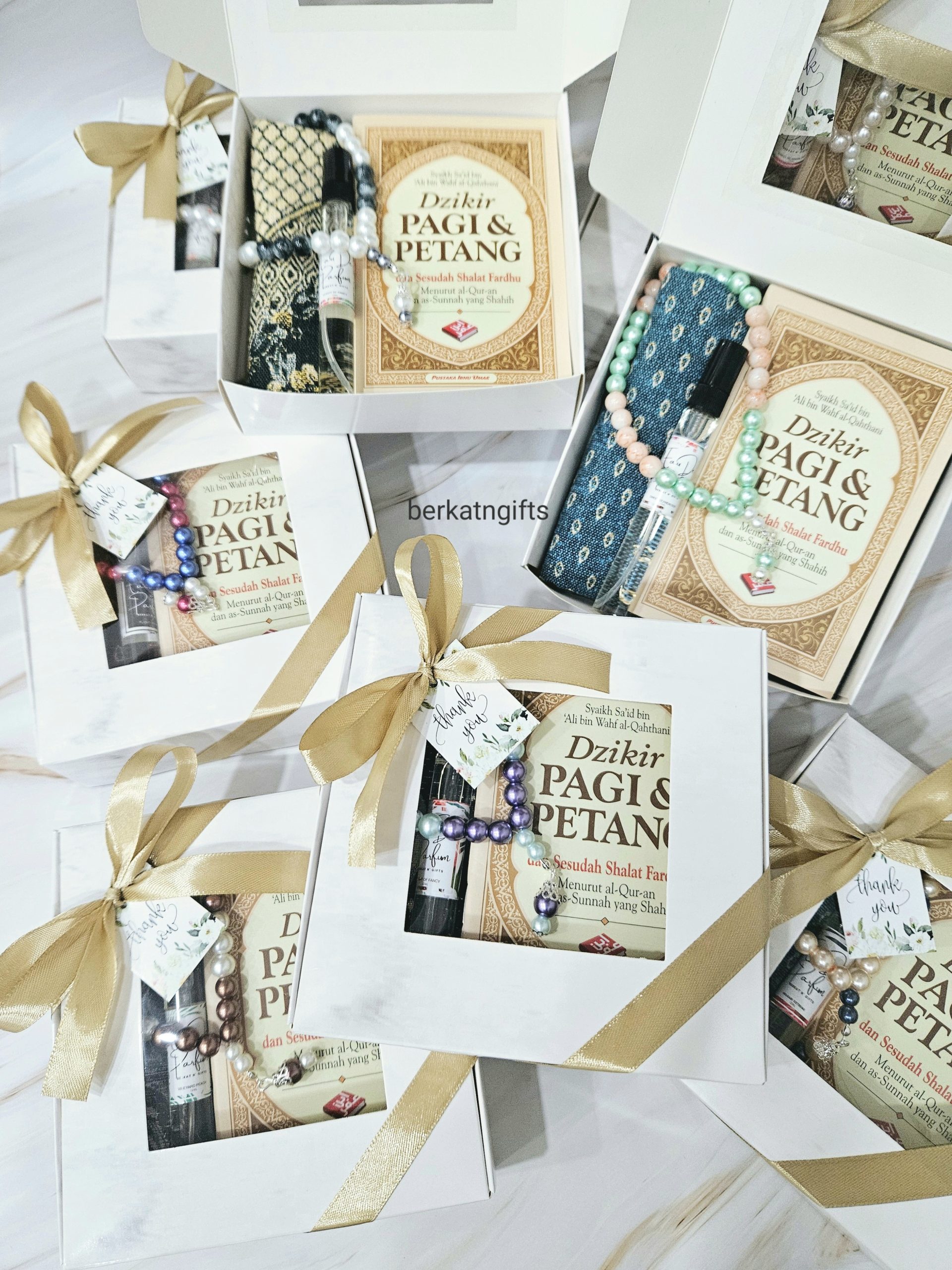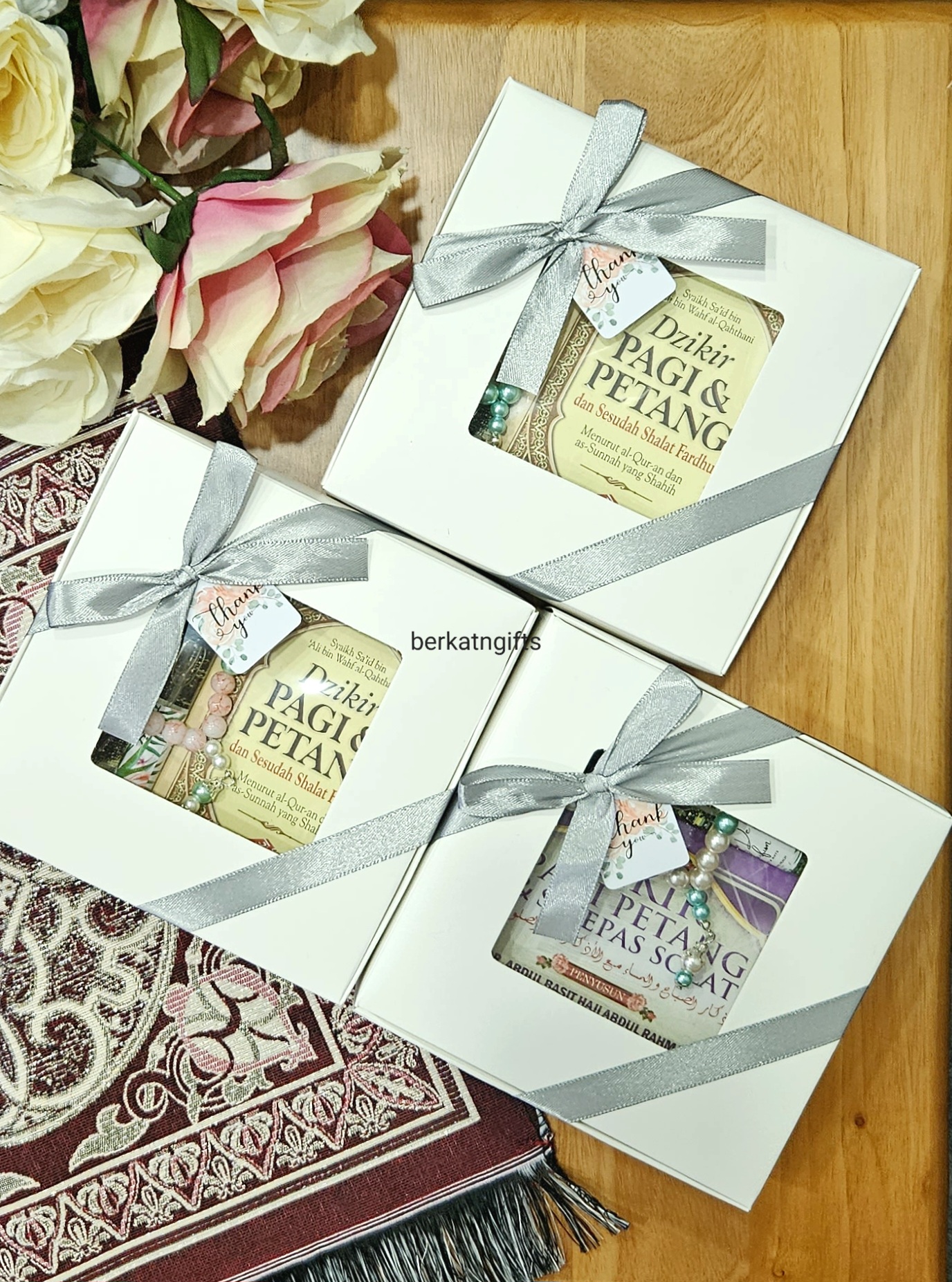Gift box includes 35cm square Turkish cotton mini sejadah, 12ml solat friendly perfume, mini tasbih and zikir book. Ribbon and thank you sticker included.